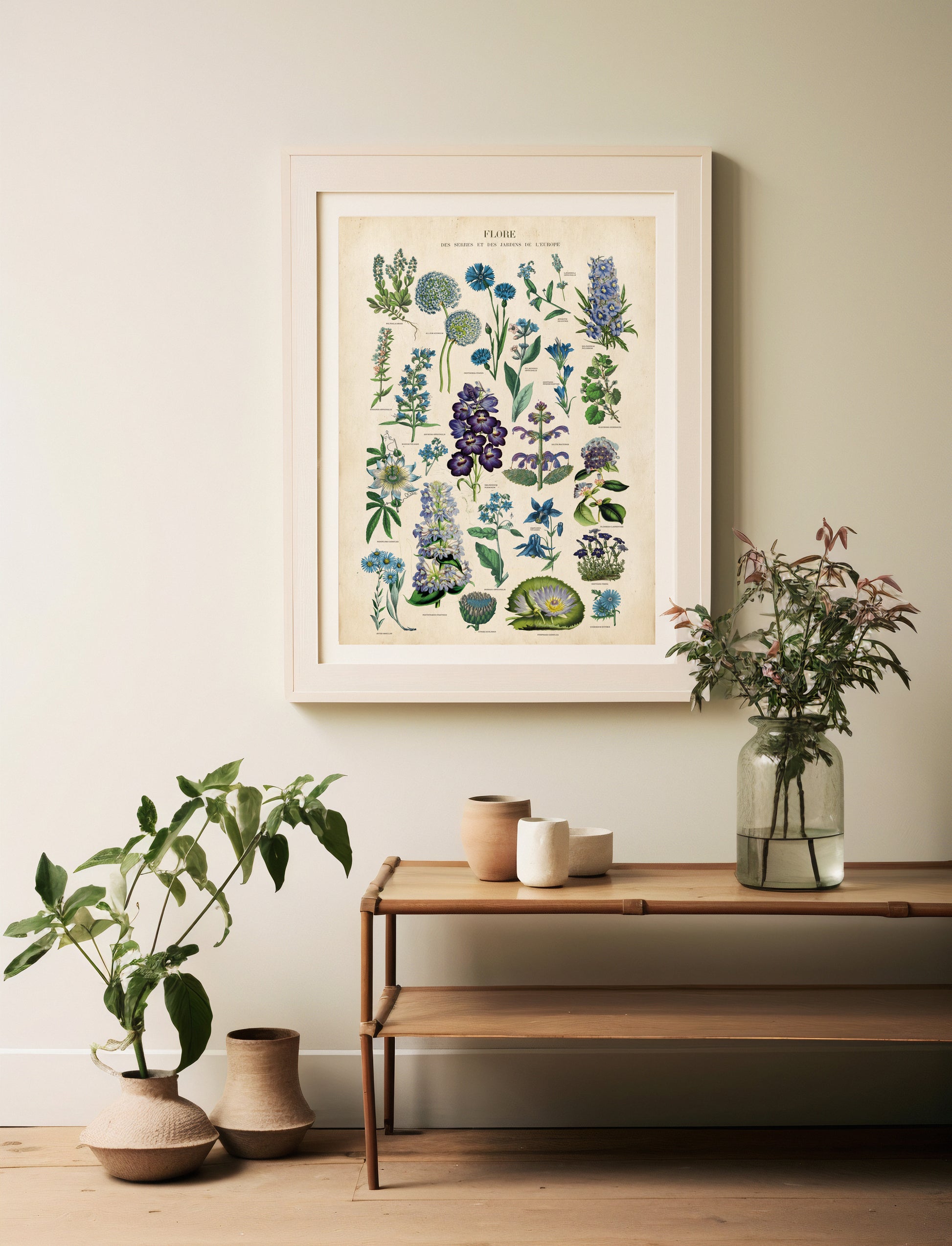 Add timeless charm to your walls with this vintage botanical chart of blue flowers, featuring stunning illustrations of nature’s most beautiful blue-hued plants. This antique-inspired poster showcases a curated collection of detailed flora, perfect for nature lovers, art collectors, and those with an appreciation for scientific illustrations.